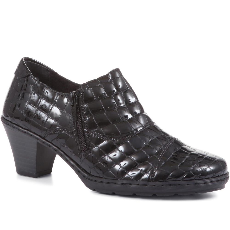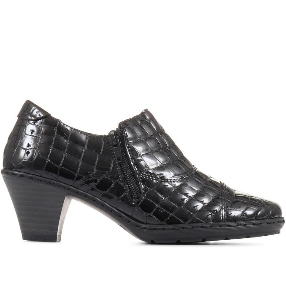 Przyciągający Wzrok Wybór Do Eleganckiej Odzieży Codziennej, Stworzony Z Mieszanki Frezowanej Skóry, Połysku I Paneli Z Efektem Krokodyla. Lekki But Do Spodni Osadzony Na Krótkiej Pięcie, Aby Zapewnić Subtelny Wzrost Na Co Dzień, Wykonany Z Miękkich Wyściółek I Funkcji Antystresowych Rieker, Aby Zwiększyć Elastyczność Stopy.